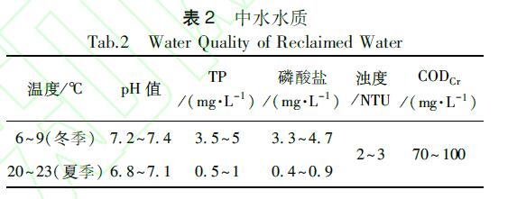 模擬含磷廢水2:采用磷酸二氫鉀和山東建筑大學中水站出水配制,模擬較差水質(即TP含量為5mg/L)。中水站出水觀察顏色為淺黃色,略渾濁,具體水質如表2所示。