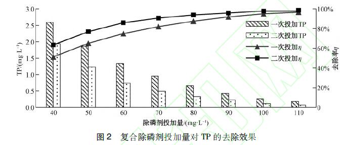 取500mL初始TP濃度為5 mg/L的實際水樣置于攪拌機上,分別按照一次、二次投加方式投加污水除磷劑,混凝后靜沉30min,取上清液進,行指標測定。由圖2可知,二次投加除磷效果好,當污水除磷劑投加量為90mg/L時,出水TP可達到0.22mg/L,此時去除率為95.9%,比一次投加時磷去除率增加了3.95%,出水TP濃度減少了近二分之一,這與配水試驗結果相似。因此,在連續流試驗中選取污水除磷劑二次投加的方式除磷。