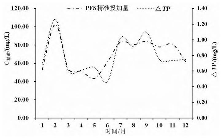 化學除磷過程反應速度快、對濃度敏感,△TP和C精準呈較好化學反應的計量關系,如圖4所示。