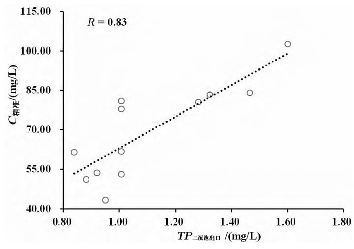 (2)通過TP二沉池出口推測C精準,其兩者線性回歸方程為C精準=59.833TP二沉池出口+3.2527(γ=0.83),并通過檢驗兩者線性顯著相關(P<0.01)。