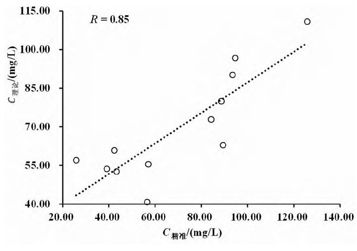 擬合線性回歸方程得C精準=0.5929C理論-27.98(γ=0.85),回歸曲線如圖2所示。經計算γ=0.85,取α=1%,查數理統計表可知γ(12)=0.697。因γ>γ(12),由此線性回歸顯著,兩者線性相關較好。